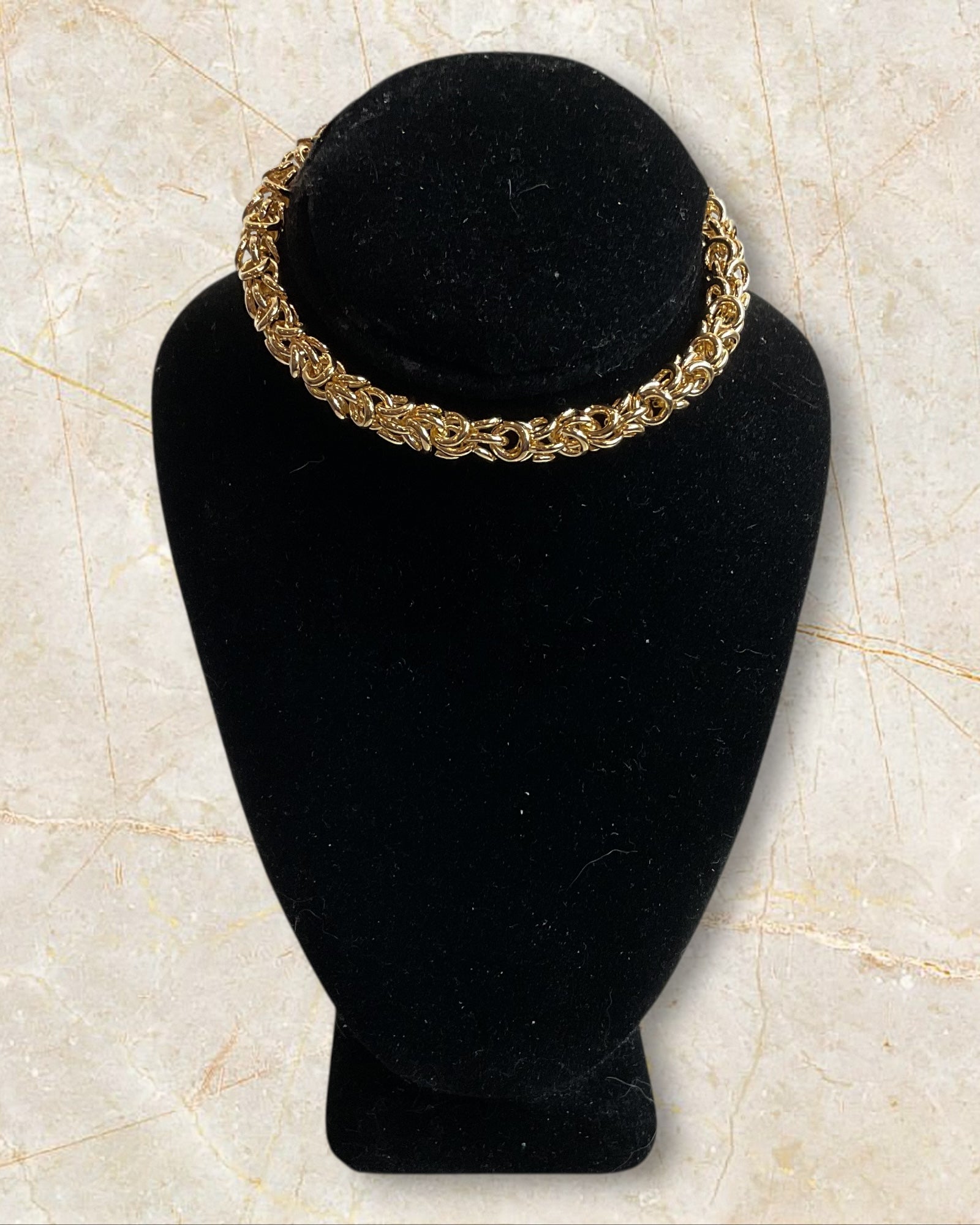 This elegant bracelet features a 7-1/2” round Byzantine design crafted in 18k gold-filled brass. Its intricate pattern offers both durability and timeless style, making it a beautiful accessory that complements any outfit while providing lasting shine and comfort. Perfect for everyday wear or special occasions, this piece adds a touch of sophistication to your collection.