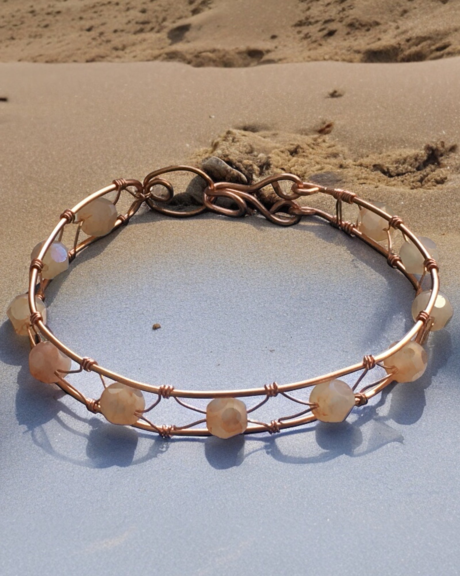 Elevate your style with this exquisite copper bracelet. Its wire-wrapped design and delicate peach faceted beads add a touch of sophistication to any outfit. With a length of 7-1/2", it's the perfect fit for any wrist. Make a statement with this luxurious piece that exudes elegance and glamour.