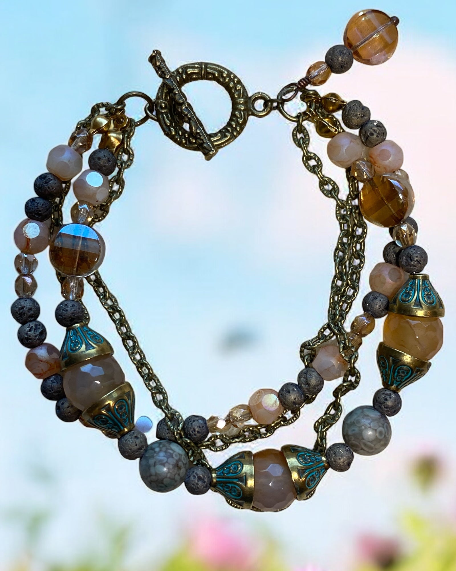 Indulge in luxury with this exquisite 3-strand bracelet. Adorned with beautiful carnelian and lava beads, accented with bronze, this bracelet exudes elegance and sophistication. Its 7-1/2" length ensures a perfect fit. Elevate your style and make a statement with this stunning piece.
