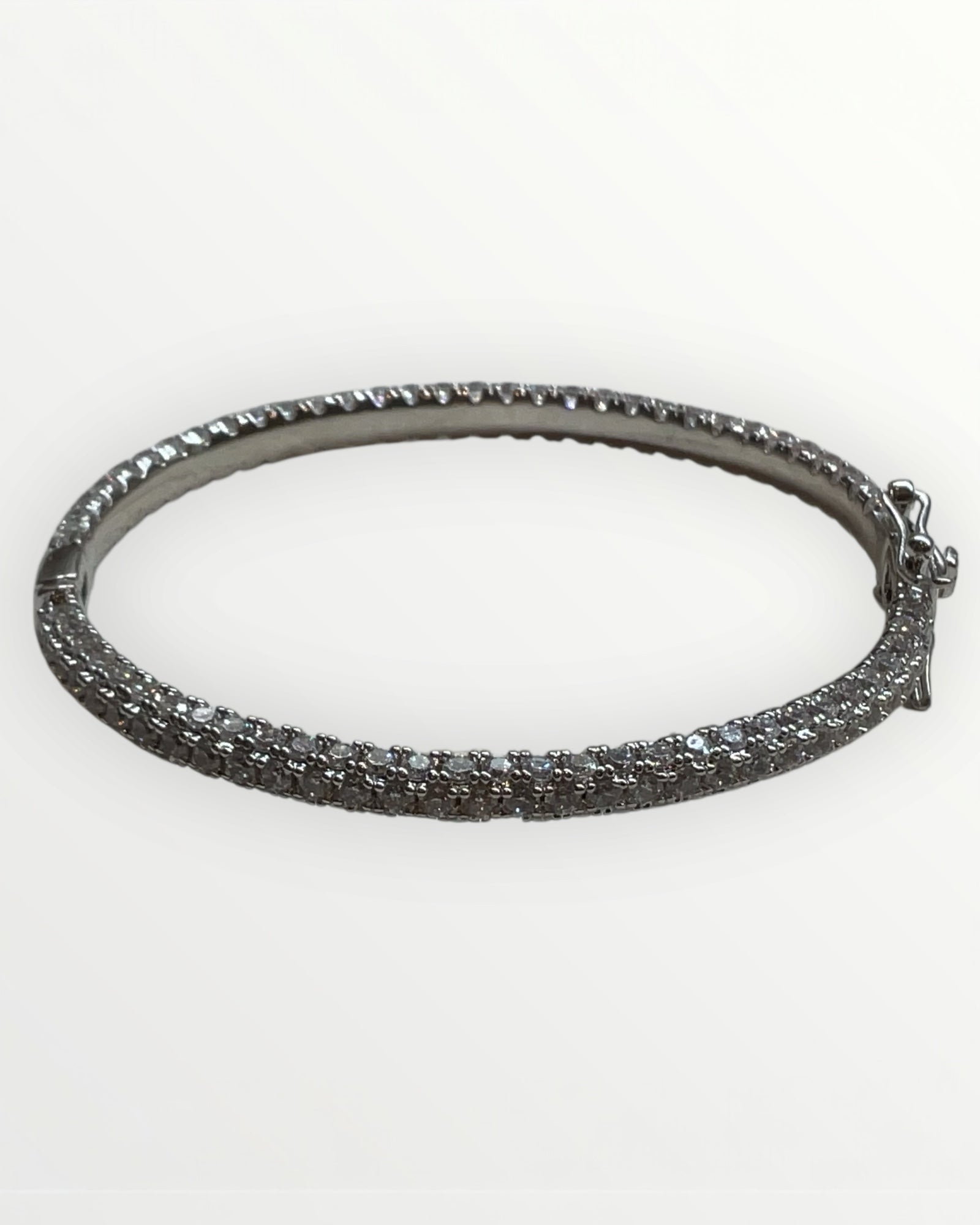 This elegant bangle bracelet features a durable white gold-filled design adorned with sparkling AAA cubic zirconia stones. Measuring 7-1/2 inches, it offers a comfortable fit that enhances any outfit with subtle, timeless shine. Perfect for daily wear or special occasions, this bracelet adds a touch of refined beauty to your jewelry collection.