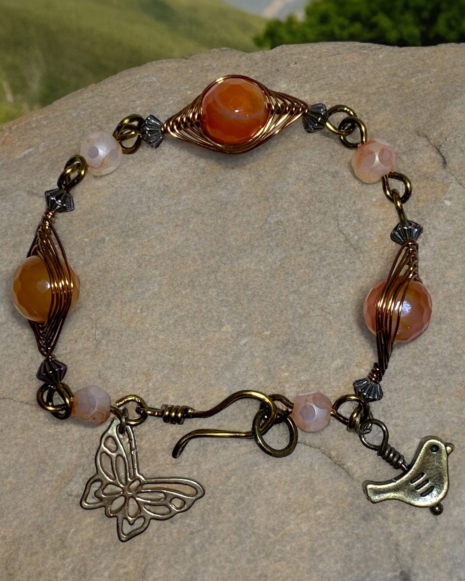 Elevate your style with our Designer Bracelet featuring luscious Carnelian beads and bronze wire accents. Measuring 7-1/2" around, this piece will add the perfect touch of elegance and playfulness to any outfit. Express your unique sense of fashion with this one-of-a-kind accessory!