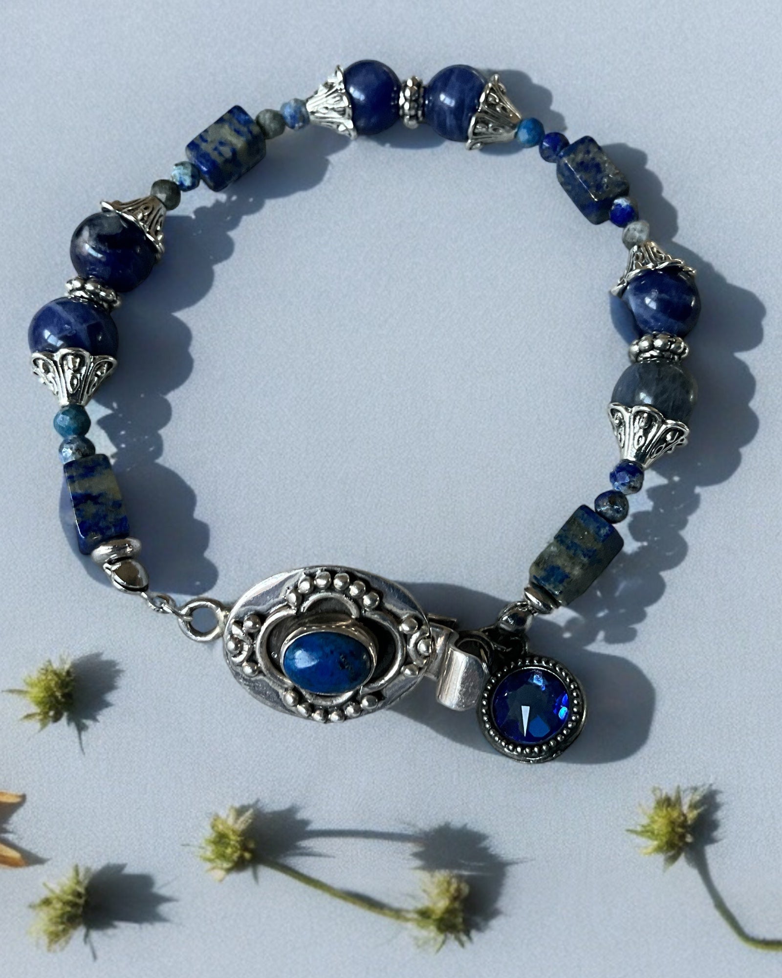 Elevate your style with our designer bracelet. Crafted with beautiful sodalite beads, a sterling silver clasp, and silver accents, this 7-3/4" bracelet adds a touch of sophistication to any outfit. A must-have accessory for any fashion-conscious individual.