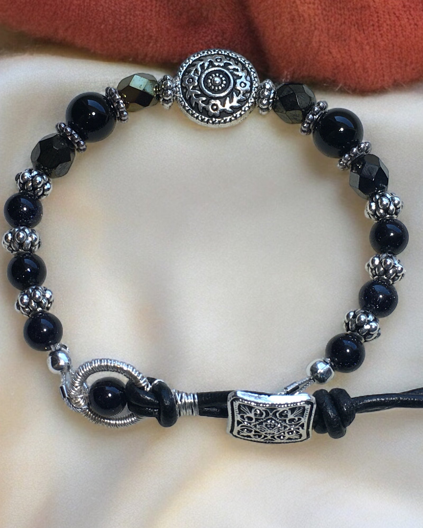 Elevate your style with our Designer Bracelet. Made with onyx and sunstone beads, accented with silver and featuring a convenient button closure. This 7-3/4" bracelet is sure to add a touch of elegance to any outfit. Upgrade your wardrobe today.
