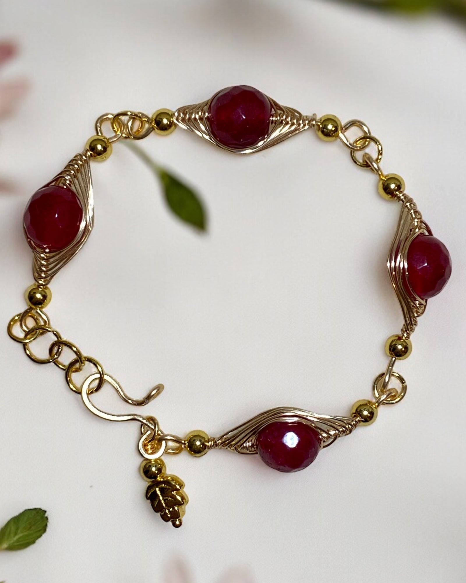 Add a pop of color to your wrist with our Red Malaysian jade Designer Bracelet. The gold accents and wire wrapped herringbone design provide a unique touch to this 7-1/2" piece. Show off your playful style with this statement accessory.