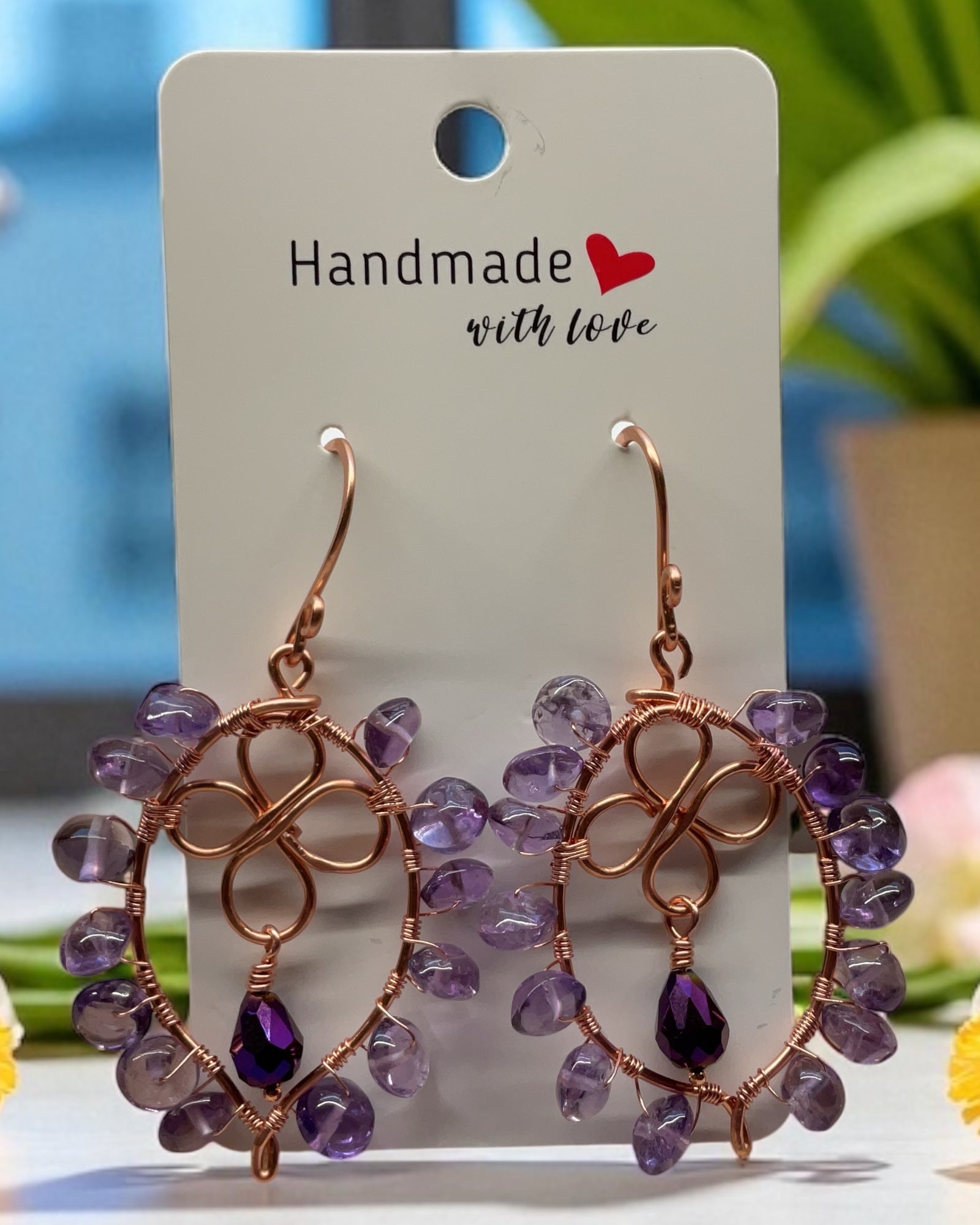 These designer earrings feature elegant copper accents paired with wire-wrapped amethyst beads, creating a delicate 1-1/2” drop. Their unique craftsmanship adds a touch of sophistication, making them a perfect accessory to complement your style with a subtle, supportive charm.