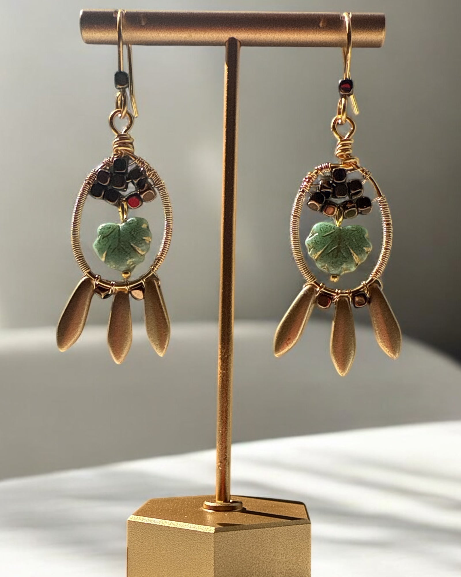 These designer earrings feature a charming combination of brown nugget beads accented with gold dagger beads, highlighted by a delicate leaf-shaped center dangle. With a graceful 2-1/2” drop, they add an elegant touch to any outfit while remaining lightweight and comfortable for all-day wear. Perfect for enhancing your style with subtle sophistication.