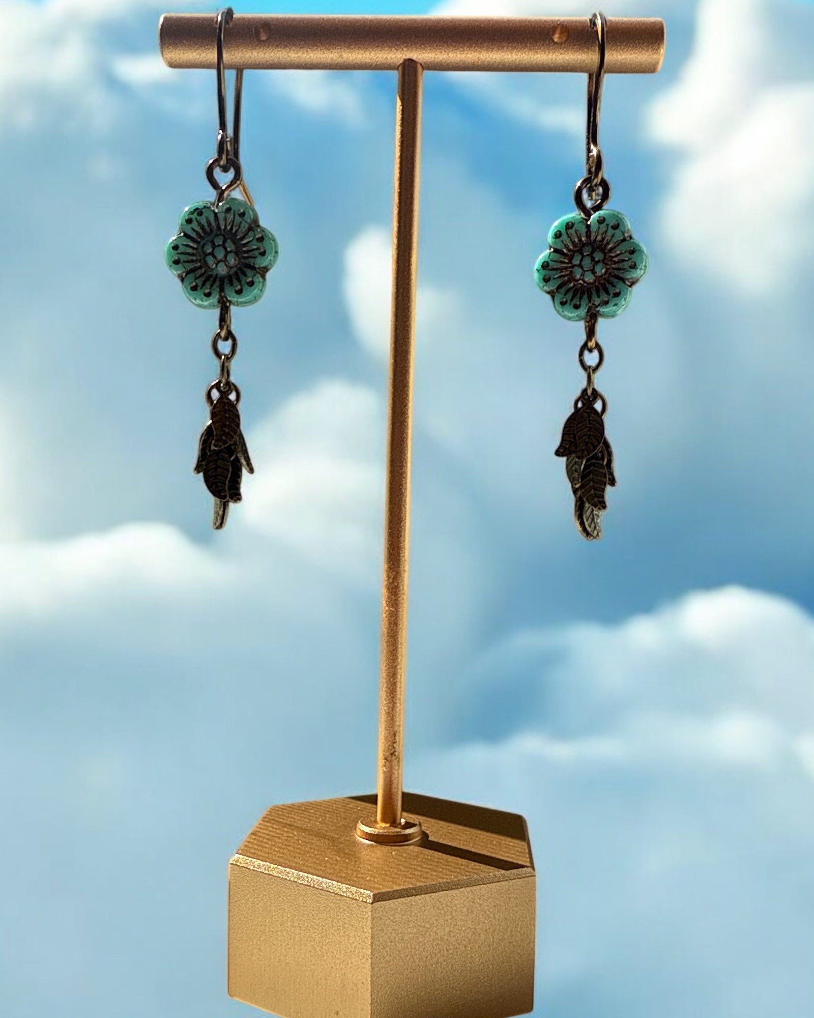 These designer earrings showcase exquisite Czech glass flower beads complemented by delicate leaf dangles and bronze accents. With a 2-inch drop, they offer a graceful and refined look that enhances your style with subtle elegance. Perfect for adding a touch of nature-inspired beauty to any outfit.