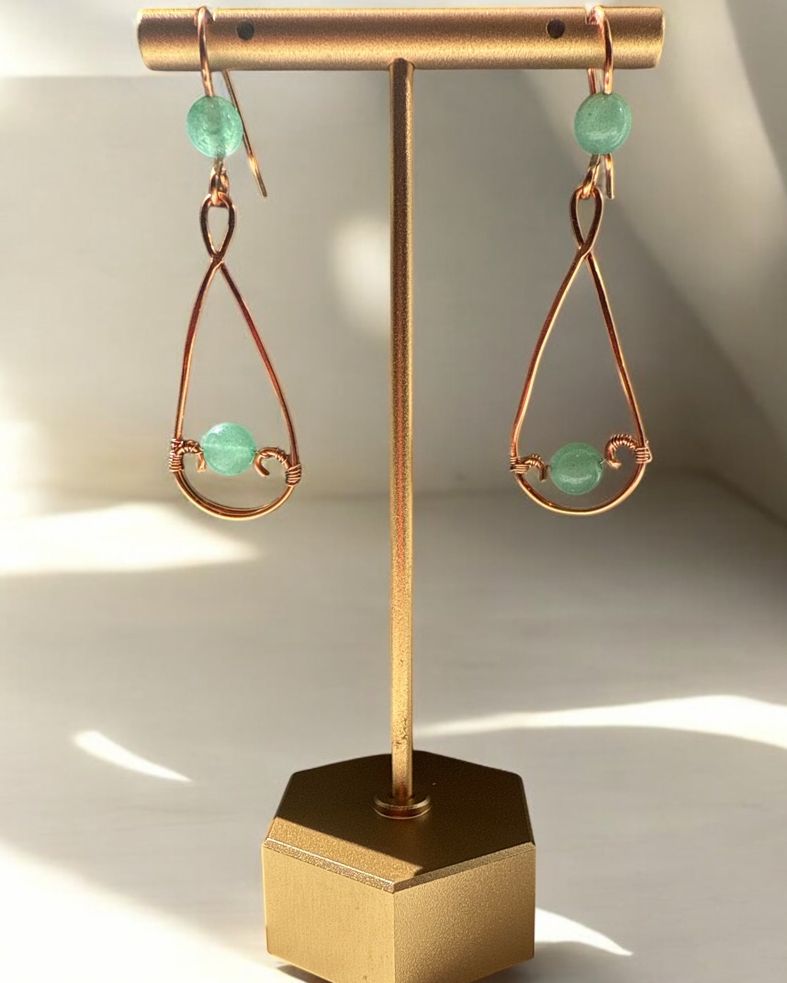 These designer earrings feature a delicate teardrop-shaped copper frame accented with vibrant aventurine beads, creating a 2-inch drop that adds a subtle yet elegant touch to any outfit. Lightweight and thoughtfully crafted, they offer both style and comfort for everyday wear or special occasions.