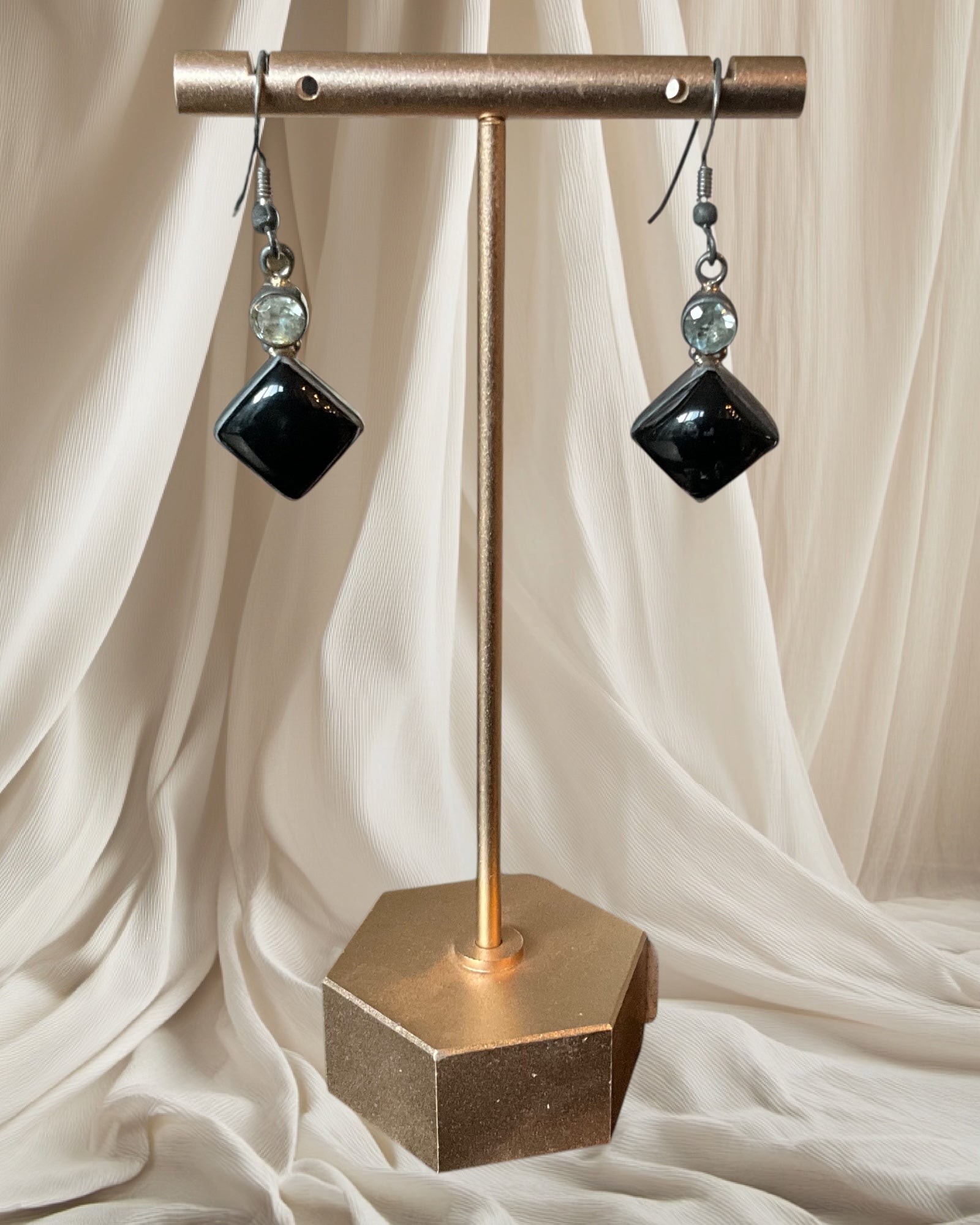 These designer earrings showcase a vintage-inspired style with striking blue topaz and deep black onyx stones. Measuring 1-1/2” in drop length, they add elegant movement and a touch of classic charm to any outfit. Perfect for complementing both casual and formal looks, these earrings offer a unique blend of color and sophistication.