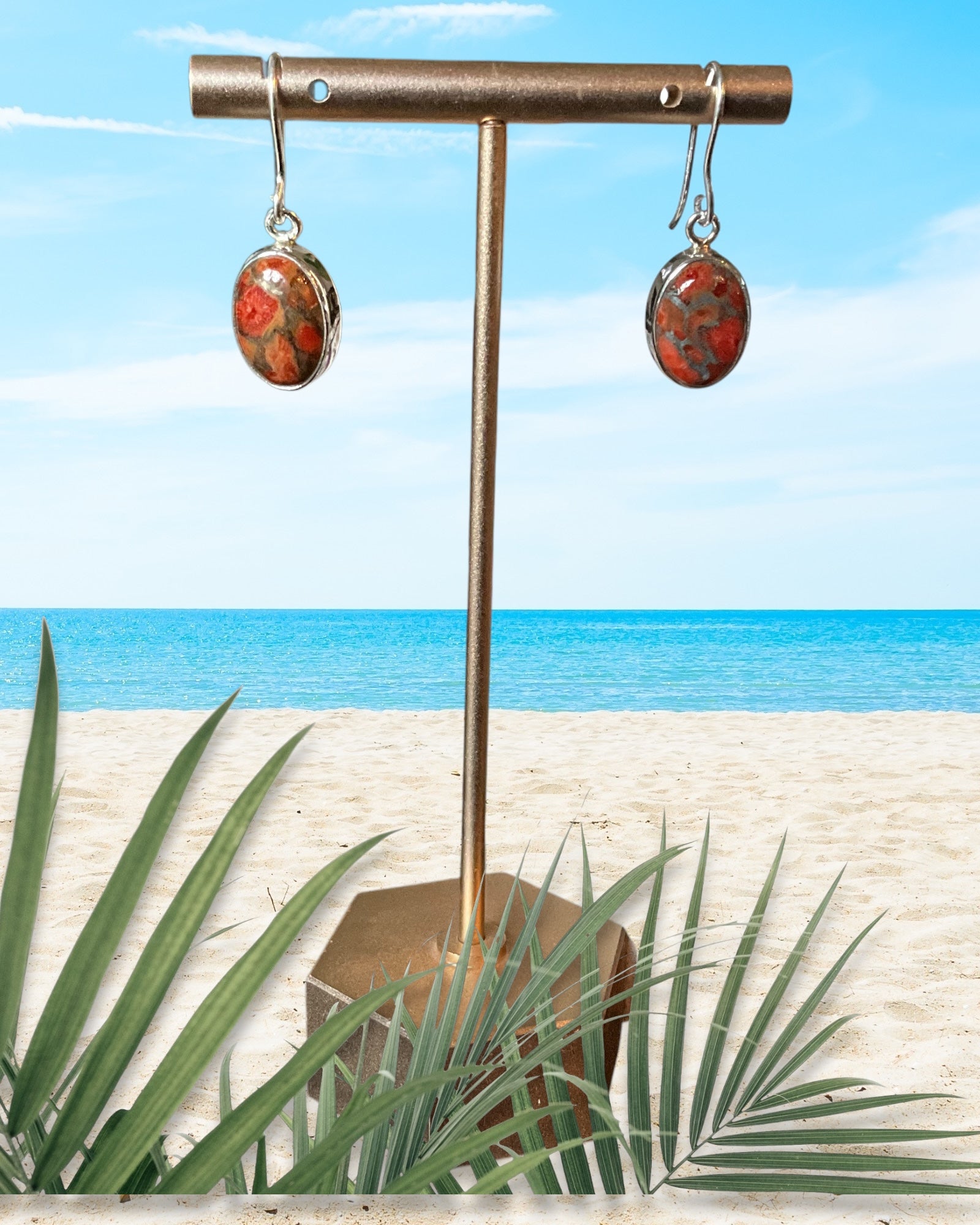 These designer earrings feature a vibrant orange Mojave turquoise set in sterling silver, with a graceful 1-inch drop that adds just the right amount of elegance. Perfect for adding a pop of color and a touch of sophistication to any outfit. Comfortable and stylish, they are an ideal accessory for both everyday wear and special occasions.