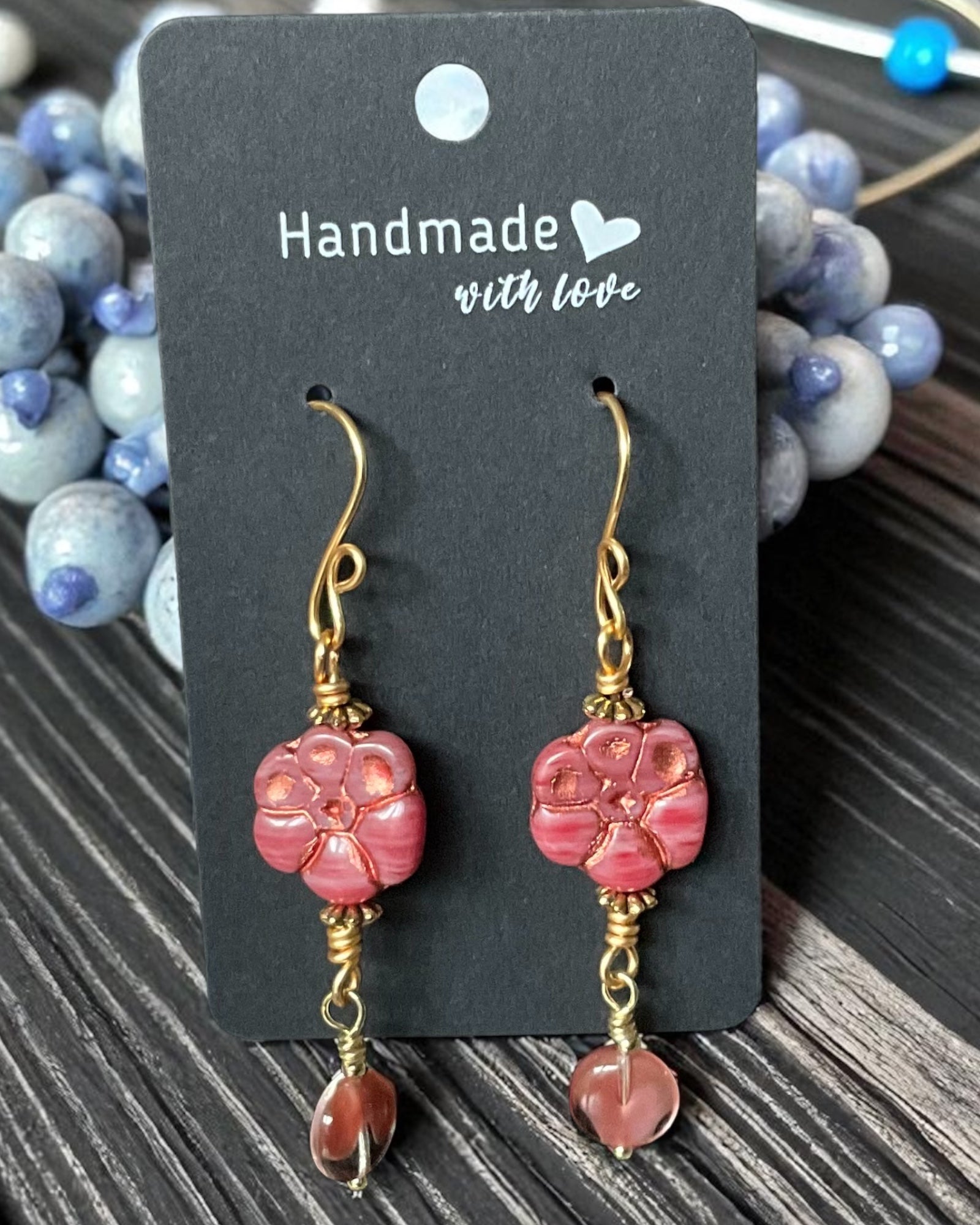 These earrings feature a delicate Czech glass flower bead paired with a vibrant cherry quartz dangle. Lightweight and elegant, they provide a supportive touch of color and charm to enhance your everyday style with natural beauty.