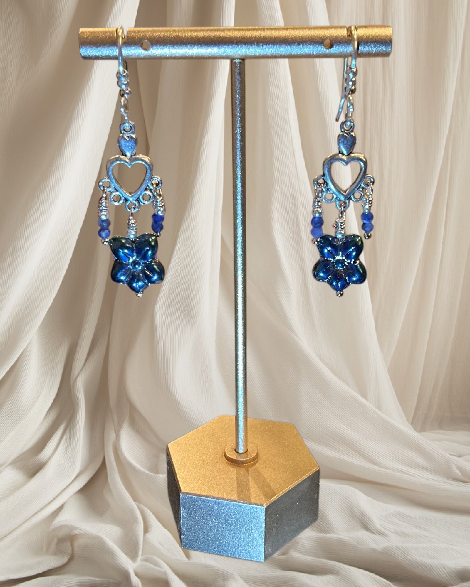 These earrings showcase a beautiful Czech glass navy flower bead set within a silver-plated frame. With a 2-inch drop, they combine delicate craftsmanship and rich color to bring a refined, elegant touch to your everyday style.