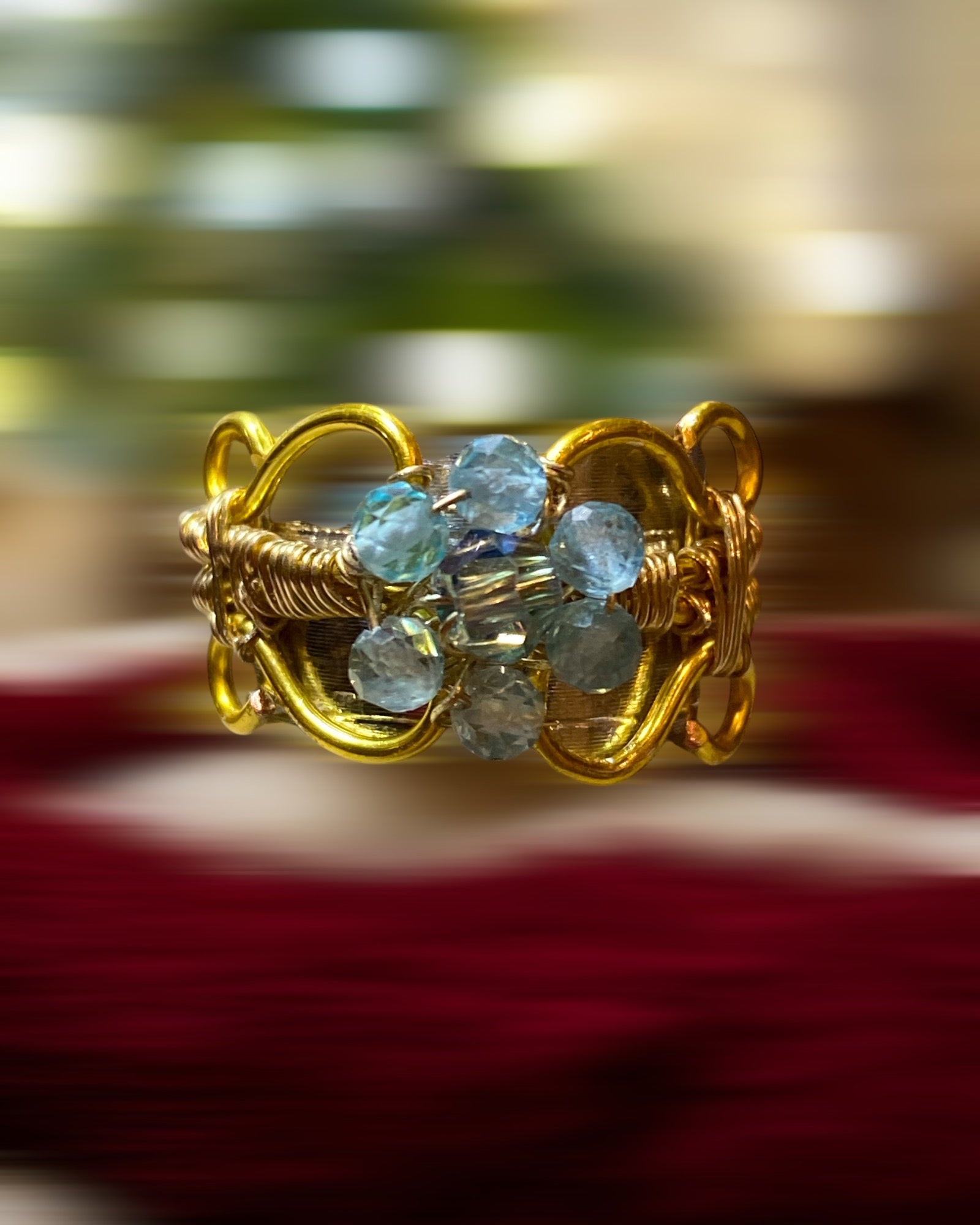 Add a touch of whimsy to your jewelry collection with this delicate aquamarine wire wrapped flower design ring, accented with pops of gold. Perfect for a size 7-1/2 finger. (Ring up your style game with this unique piece!)